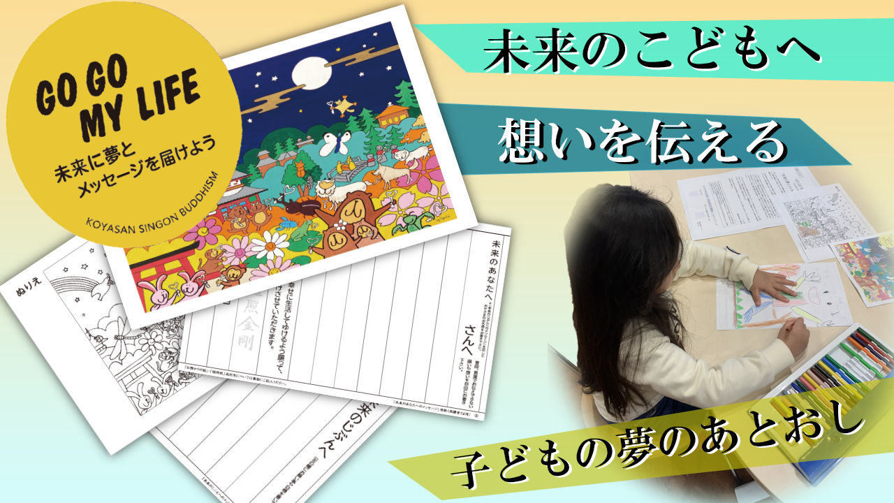ぬりえ・「みらいのじぶんへのメッセージ」(お子さま用)・「みらいのあなたへのメッセージ」(保護者さま用)・シール・封筒各2セット・概要書・冊子各 1枚