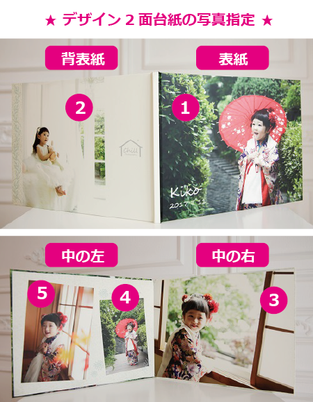 ■Chill Photo Book ①表紙(1枚)、②背表紙(1枚)、③中のお写真(30〜35枚)をご指定ください。表紙・背表紙と中のお写真は、同じものをセレクトして頂いても構いません。また、表紙に文字入力をご希望の場合は、ご希望の文字をご記載下さい。 ■デザイン2面台紙 ①表紙(横)、②背表紙(縦)、③中の右(横)、④中の左(縦)、⑤中の左(縦)ごとに写真をご指定ください。また、表紙に文字入力をご希望の場合は、文字をご記載下さい。(英数字のみ)