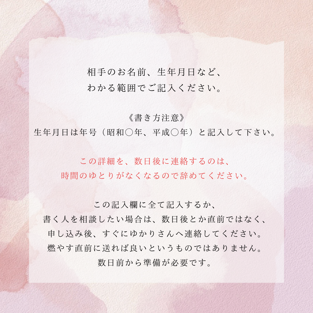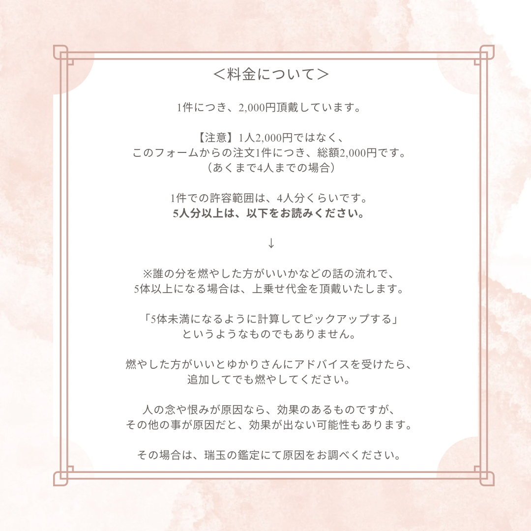 こちらは、人の恨み、念祓い、運気上昇、開運祈願のお焚き上げ申込みフォームです。