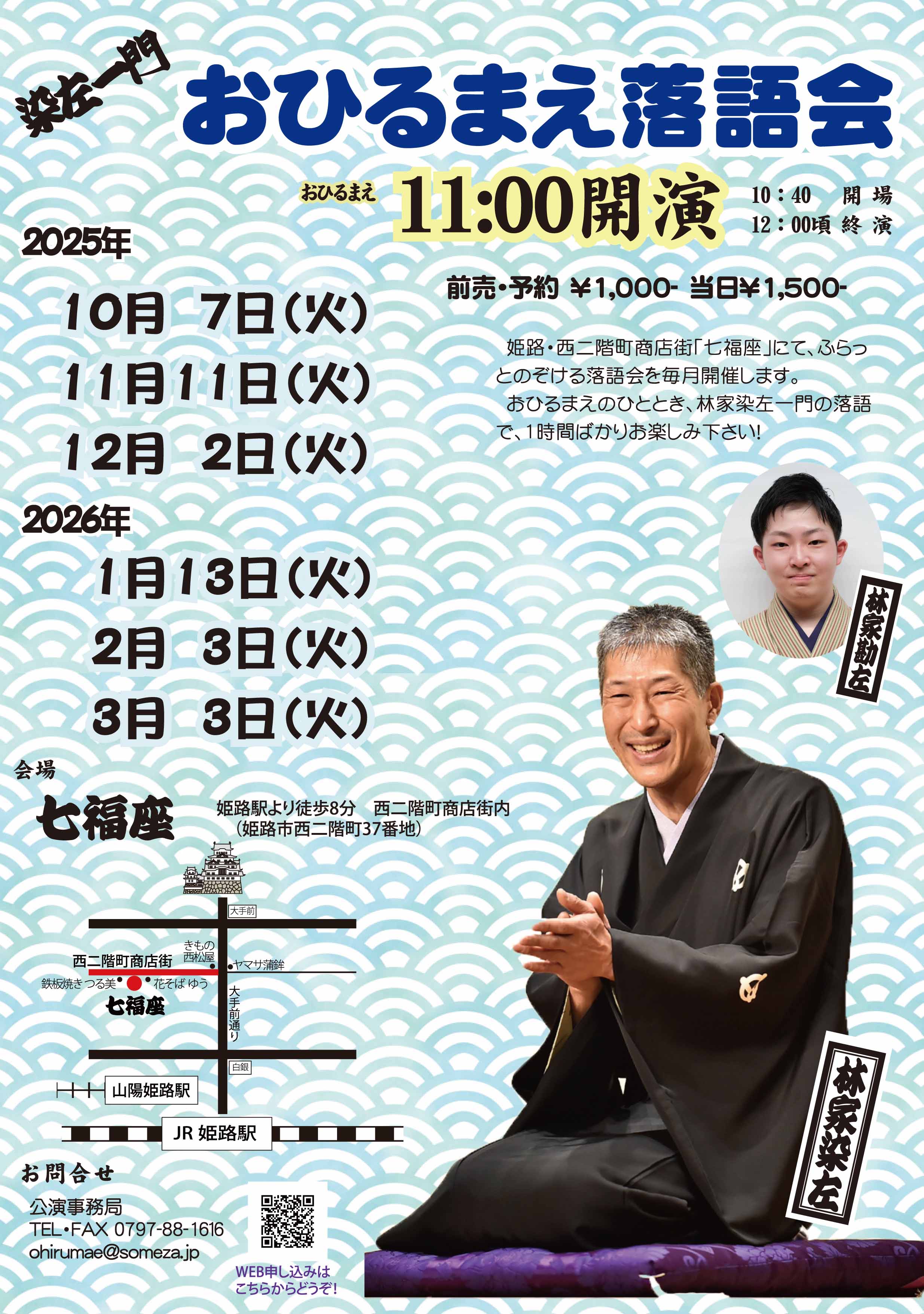 姫路・七福座で、おひるまえにフラッとのぞける落語会を毎月開催します。 11時から1時間ほど、林家染左一門の落語でお気軽にお楽しみ下さい!