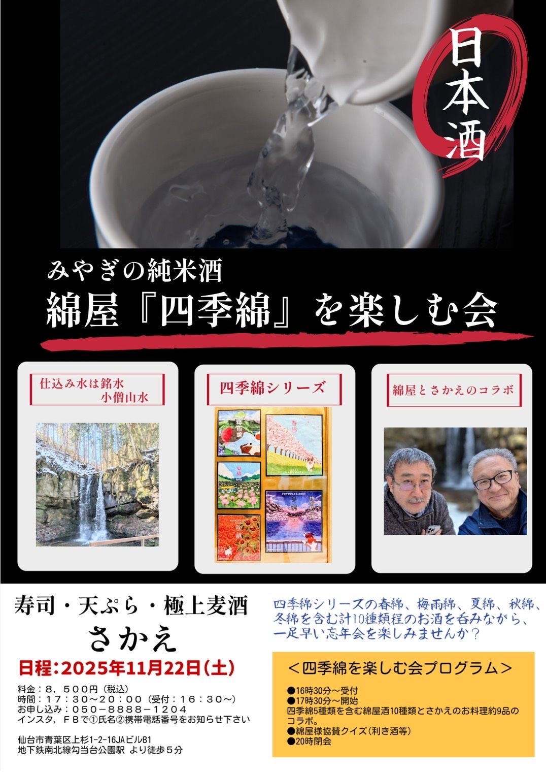 四季綿5種類を含む綿屋酒10種類とさかえのお料理約9品のコラボ