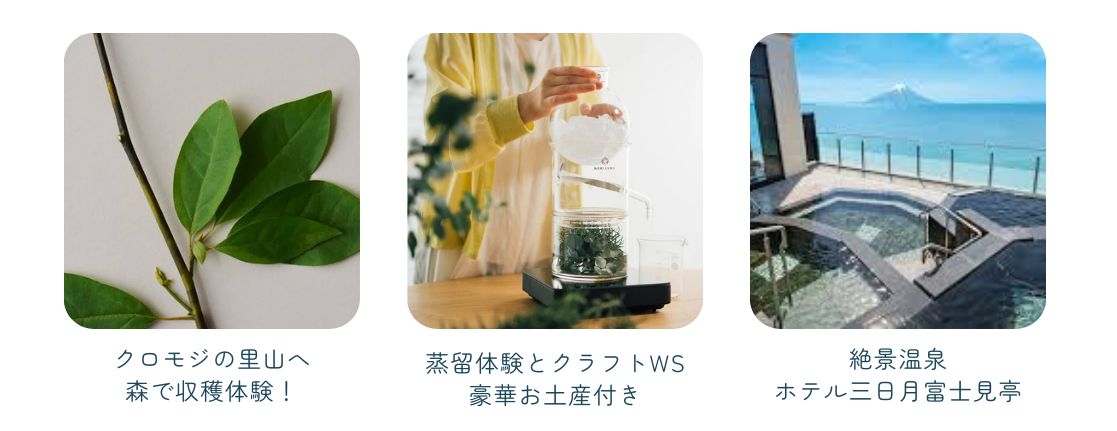 一人あたり47,600円(ツインルーム宿泊費、食事2食、クロモジ精油1ml、芳香蒸留水500ml、アロマクラフト、クロモジ茶、講義資料、保険代、その他お土産付き)