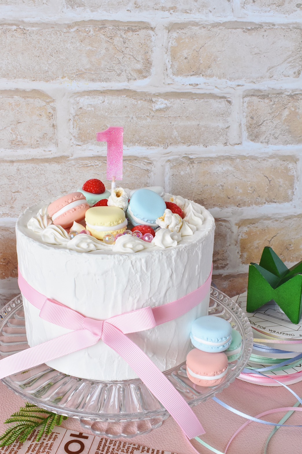 ◉デコレーション:粘土でできたマカロンなどのスイーツやイチゴ、ビーズ、小枝や木の実などの自然素材、フェイクグリーン、リボンなど