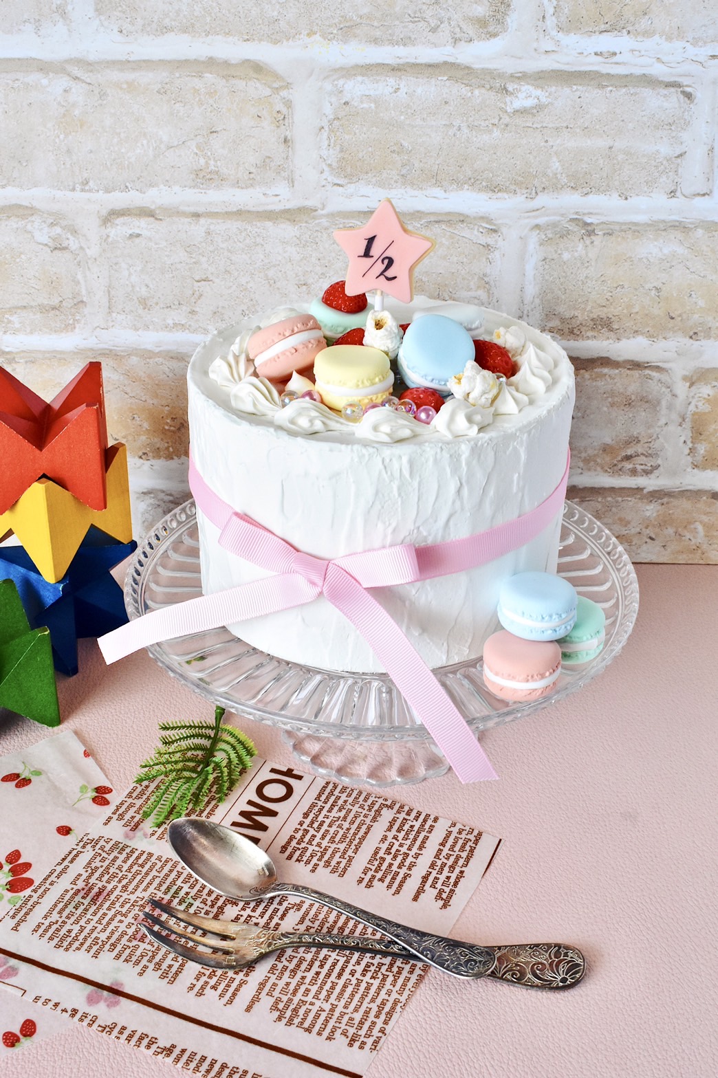粘土のホイップでできた土台に、スイーツやグリーンを飾り付けて撮影用のケーキを作るワークショップです。
