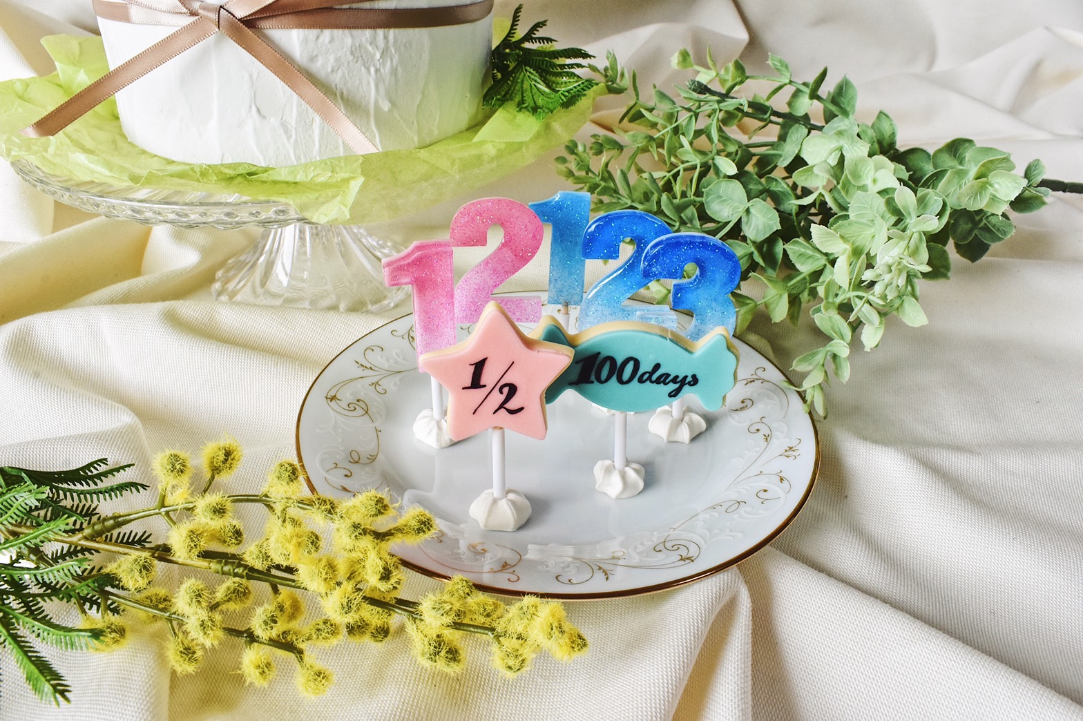 月齢や年齢を示すケーキトッパーはおひとつお選びいただけます(100days,1/2,1,2,3)。