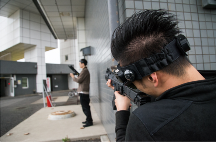 当たっても痛くない安全なレーザー銃とセンサーを装備して対戦するレーザーサバイバルゲームを行います。