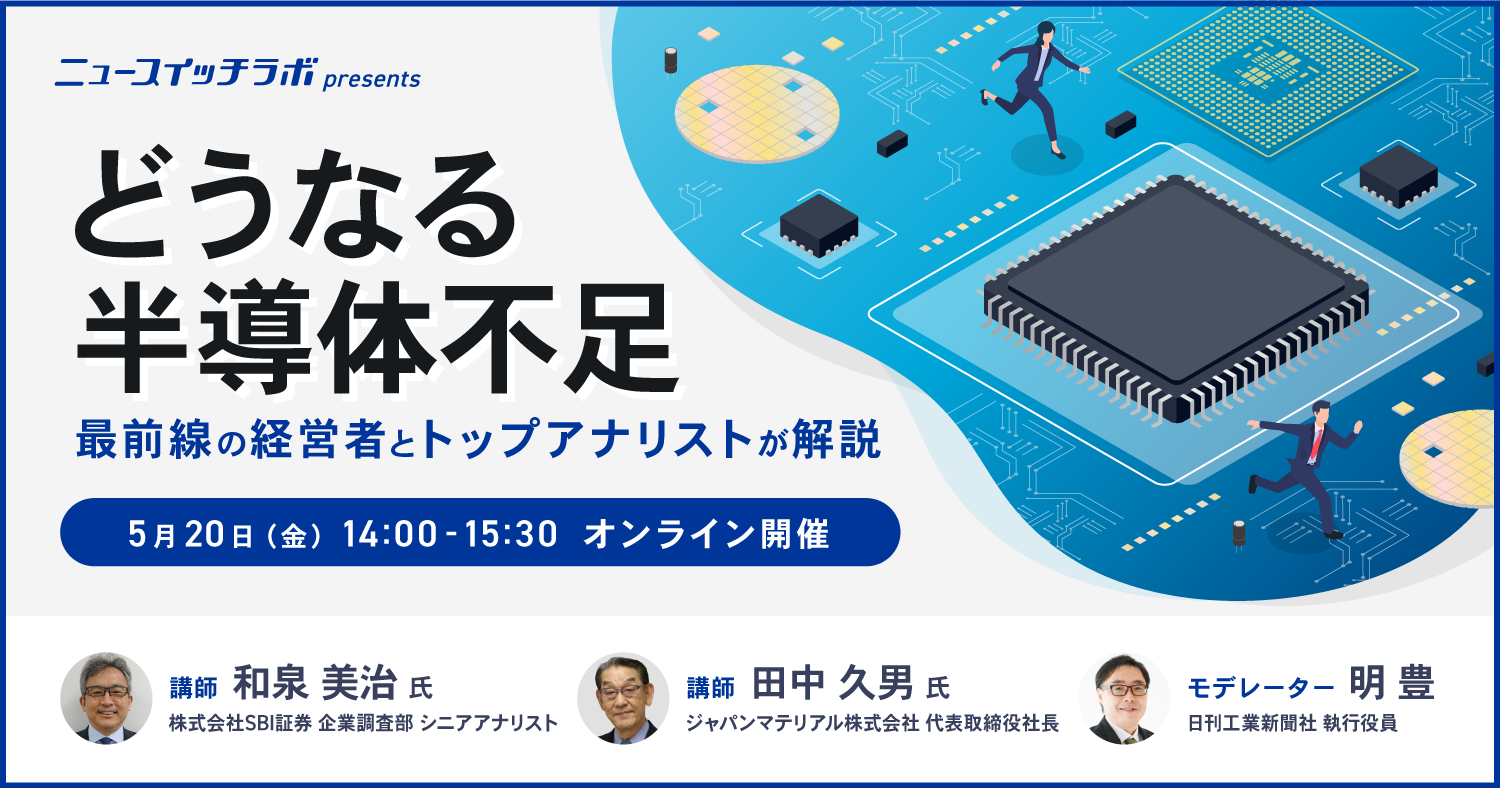 本セミナーでは2つのセッションから、半導体産業の行方について解説します。半導体工場に対する技術のフルサポートをしているジャパンマテリアルの田中久男社長は、国内外のサプライチェーンや日本の国家戦略にも精通しています。「半導体不足の裏側で何が起きているのか」。第一線で活躍する経営者から生の情報を伺います。また、半導体セクターで長くトップアナリストであり続けるSBI証券の和泉美治氏から、足元の市況や今後の予測についてプレゼンテーションしていただきます。