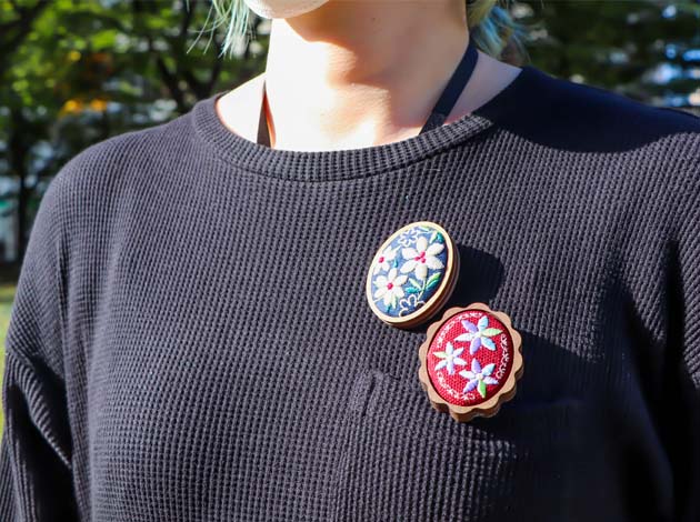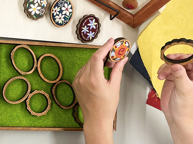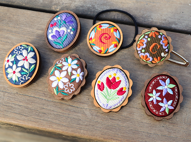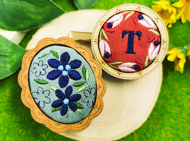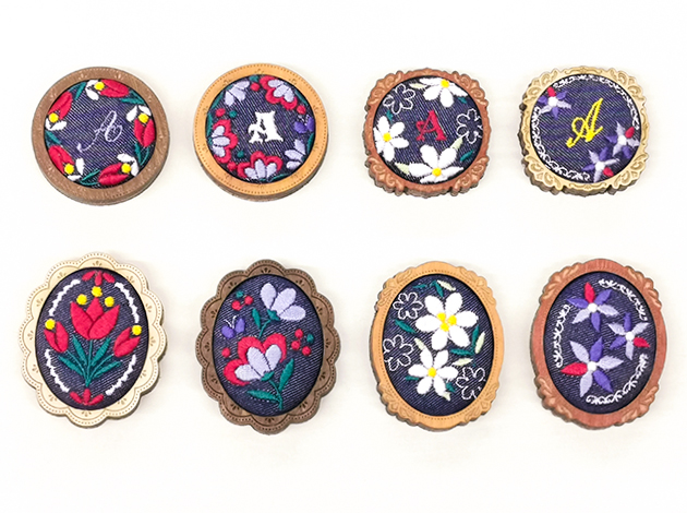 刺しゅうブローチはお好きな柄・糸色・生地・木枠を選ぶことができるので、世界に一つだけのオリジナルデザインに仕上がります。