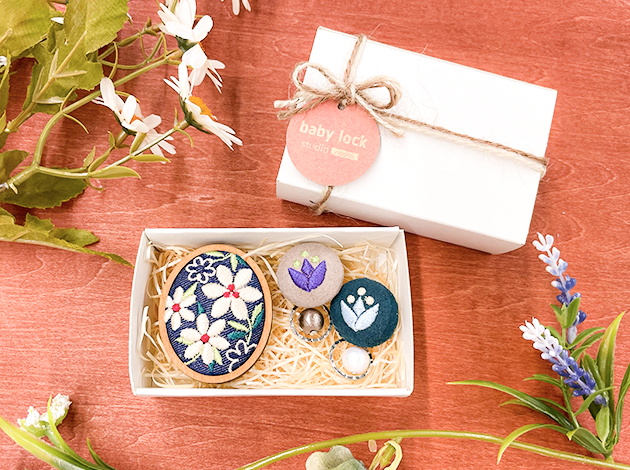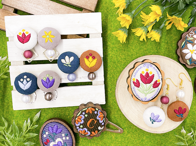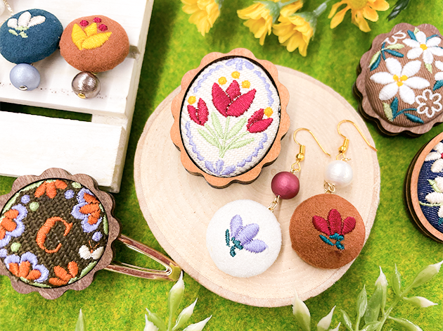 装いを彩る華やかなボタニカル刺しゅうブローチと、くるみボタンのピアスがセットになったワークショップ。