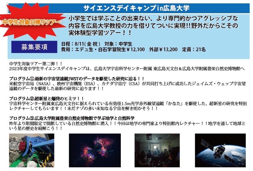 2023年度中学生サイエンスデイキャンプは、広島大学宇宙科学センター附属 東広島天文台&広島大学附属豊栄自然史博物館へ