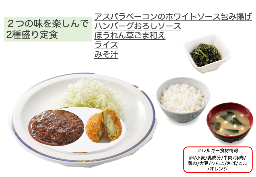 ②ハンバーグおろしソース&アスパラベーコンのホワイトソースつつみ揚げの2種盛定食・小鉢・ライス・味噌汁つき