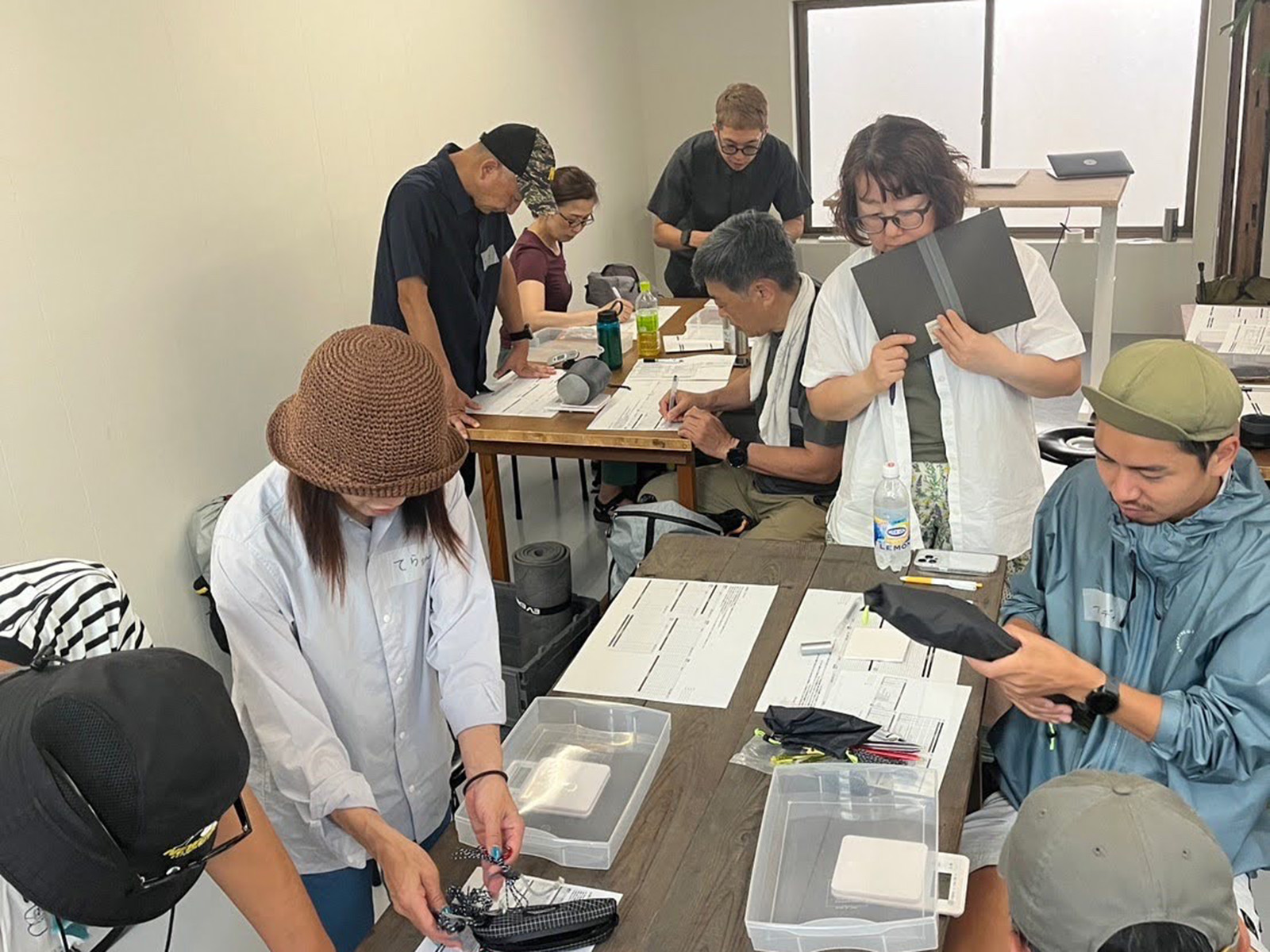 山と道HLC関西アンバサダーの中川を講師に、各自が持参した道具のギアリストを作成しながら道具の取捨選択の方法を知り、UL装備化の手順やポイントを座学形式で学んでいきます。
