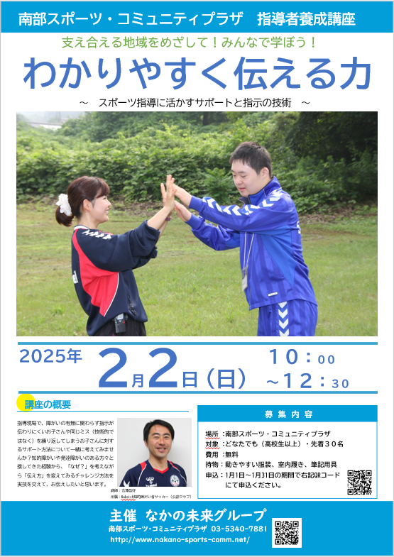 指導現場で、障がいの有無に関わらず指示が伝わりにくいお子さんや同じミス(技術的ではなく)を繰り返してしまうお子さんに対するサポート方法について一緒に考えてみませんか?知的障がいや発達障がいのある方々と接してきた経験から、「なぜ?」を考えながら「伝え方」を変えてみるチャレンジ方法を実技を交えて、お伝えしたいと思います。