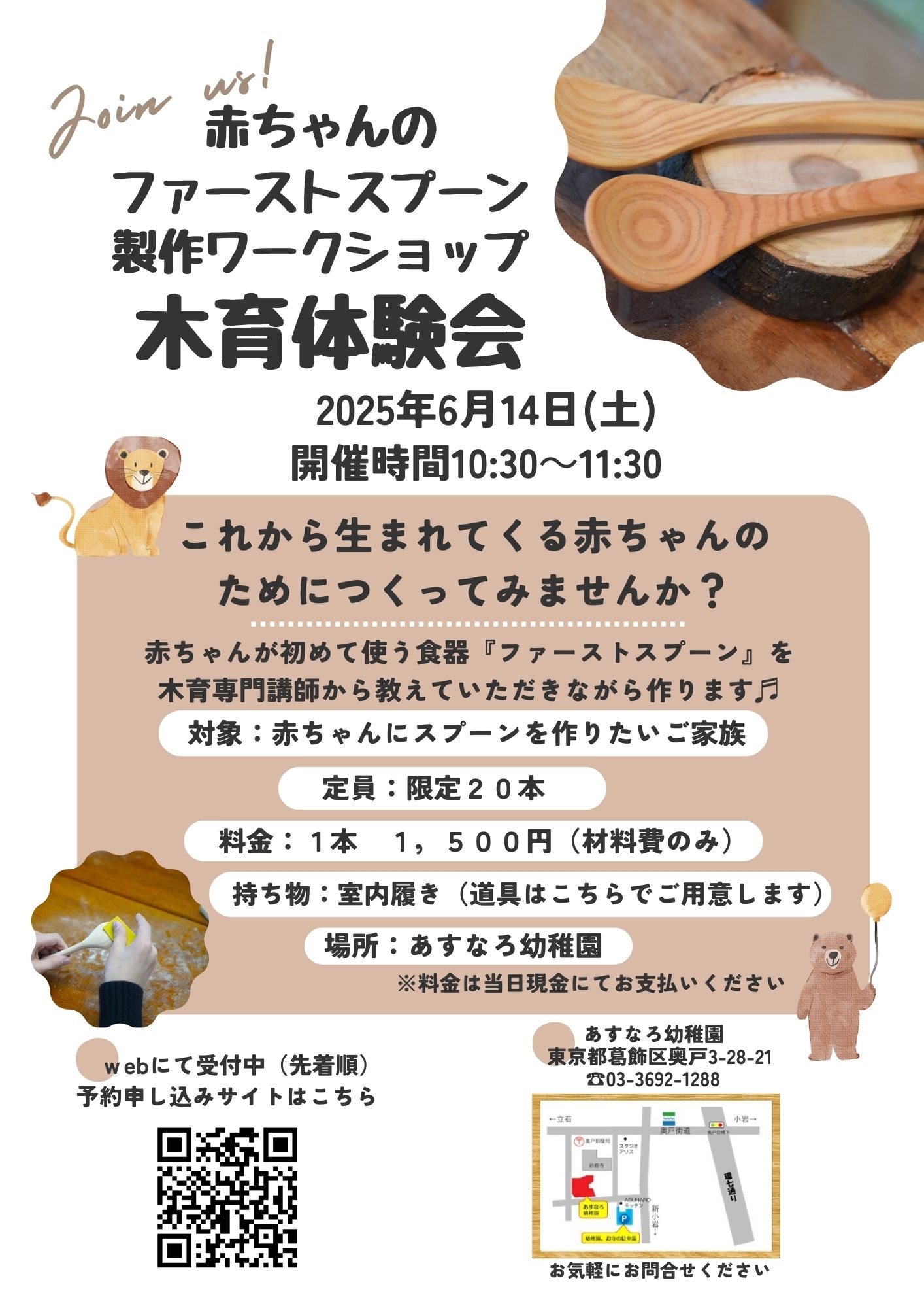 赤ちゃんが最初に使う初めての食器「ファーストスプーン」を木育専門講師から教えて頂きながら作ります。