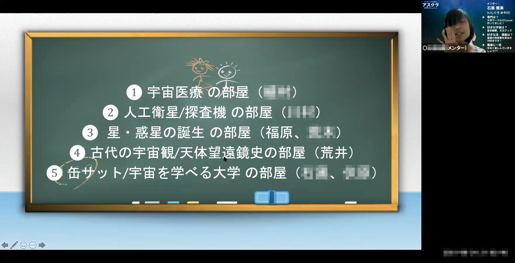 オンライン宇宙部活アスクラとは、地域・年齢・性別が異なる多様な仲間たちと交流しながら、宇宙について学べる中高生のためのオンラインコミュニティです。