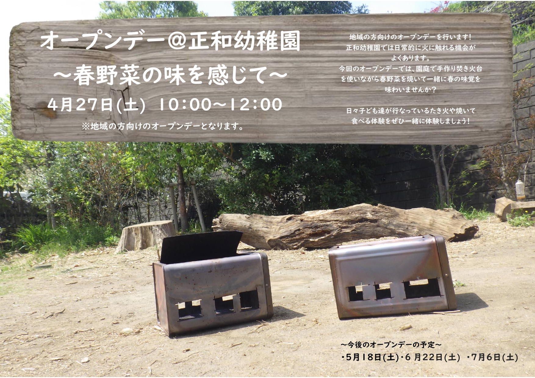 地域の方向けのオープンデーを行います! 正和幼稚園では日常的に火に触れる機会がよくあります。 今回のオープンデーでは、園庭で手作り焚き火台を使いながら春野菜を焼いて一緒に春の味覚を味わいませんか? 日々子ども達が行なっているたき火や焼いて食べる体験をぜひ一緒に体験しましょう!