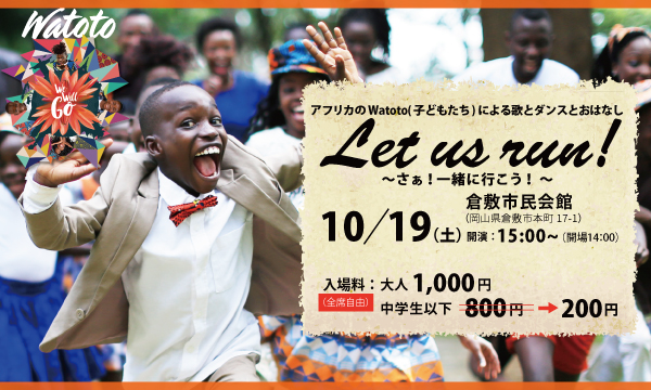 Watoto(ワトト)とはスワヒリ語で「子どもたち」という意味。彼らは、歌や踊りを通して、アフリカの子どもたちが持っている希望のメッセージを世界中に届けるという使命を持っている。彼ら自身も世界をまわることで、悲しみと絶望から立ち上がるための自信と勇気を得ている。温かい歓迎で、彼らと心を交わそう。