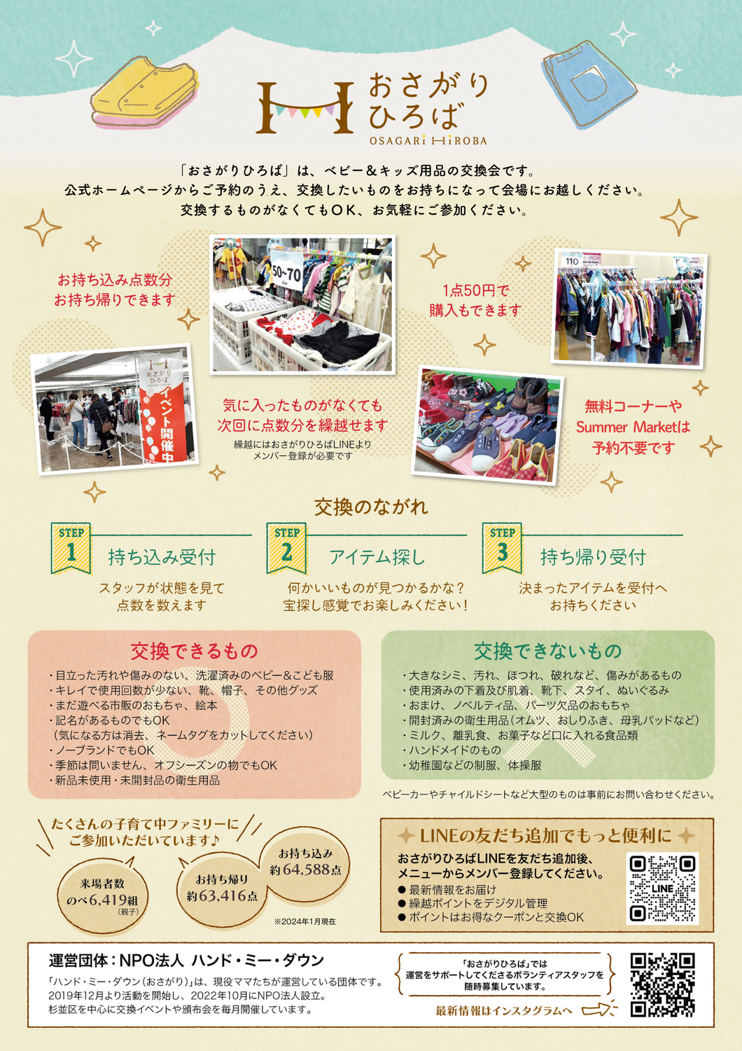 不要なベビー&キッズ用品を持ち寄り、今のお子さまに必要なモノに交換できるイベント「おさがりひろば」を企画・運営しています。