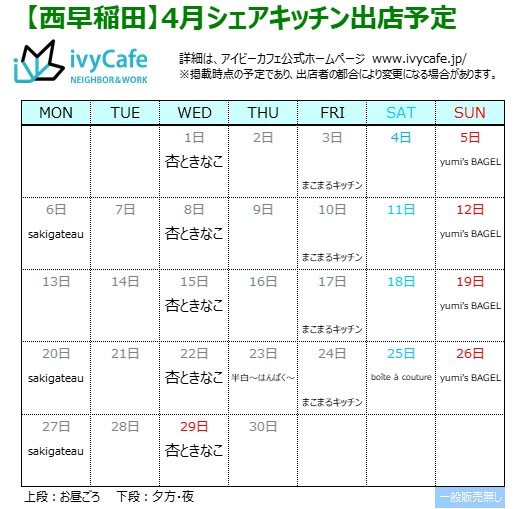 営業日時:4月6日(月)、20日(月)、27日(月)