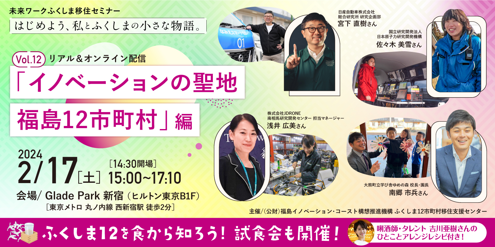 福島12市町村で実際に活躍する多様なゲストをテーマ別でお呼びし、ご自身の移住を決めたきっかけやその経緯、移住後の実際の生活や活動の様子について、リアルな実体験をお話しする、未来ワークふくしまの移住セミナー。次回は「vol.12 イノベーションの聖地 福島12市町村」編を東京にて開催します!