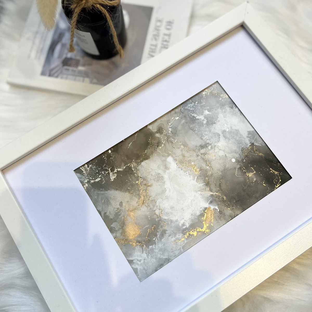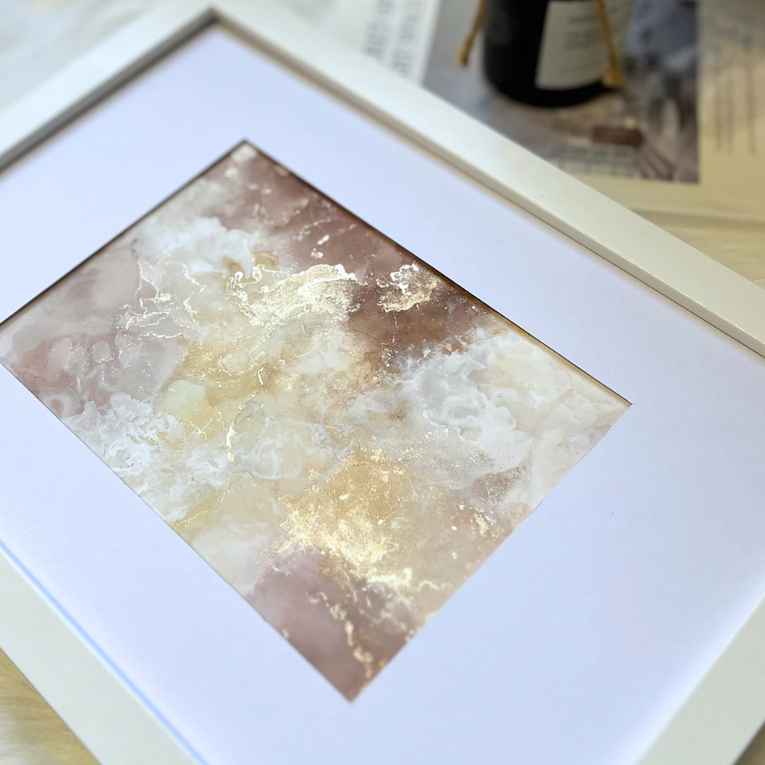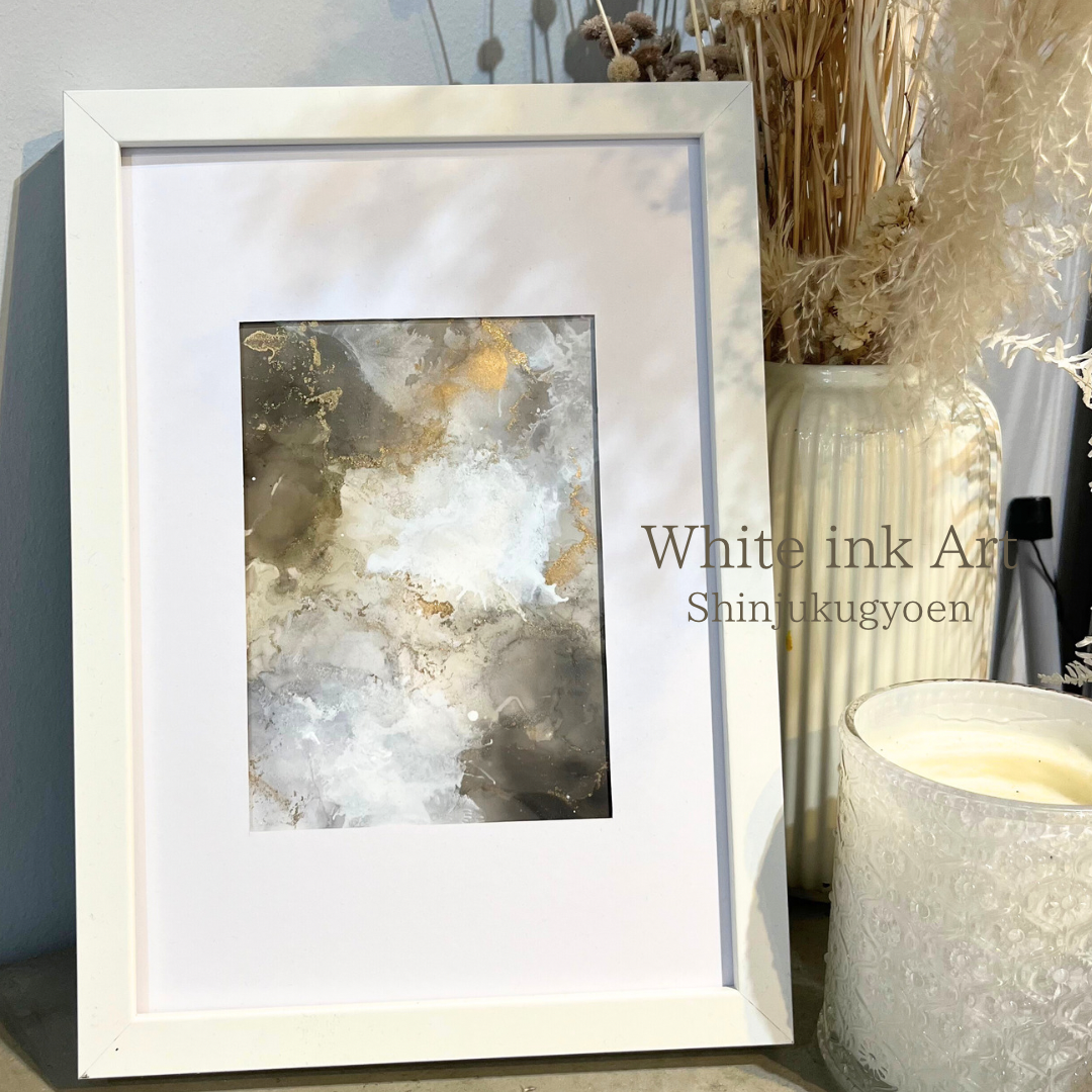 アルコールインクとホワイトインクを息で吹き広げ、ホワイトインク特有のミルキー感ある作品を作成していただけます。