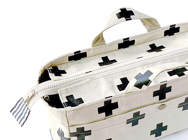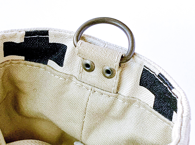 表布は、赤峰さんがデザインしたクロス柄10号パラフィン帆布の新色「ネイビー」です。
