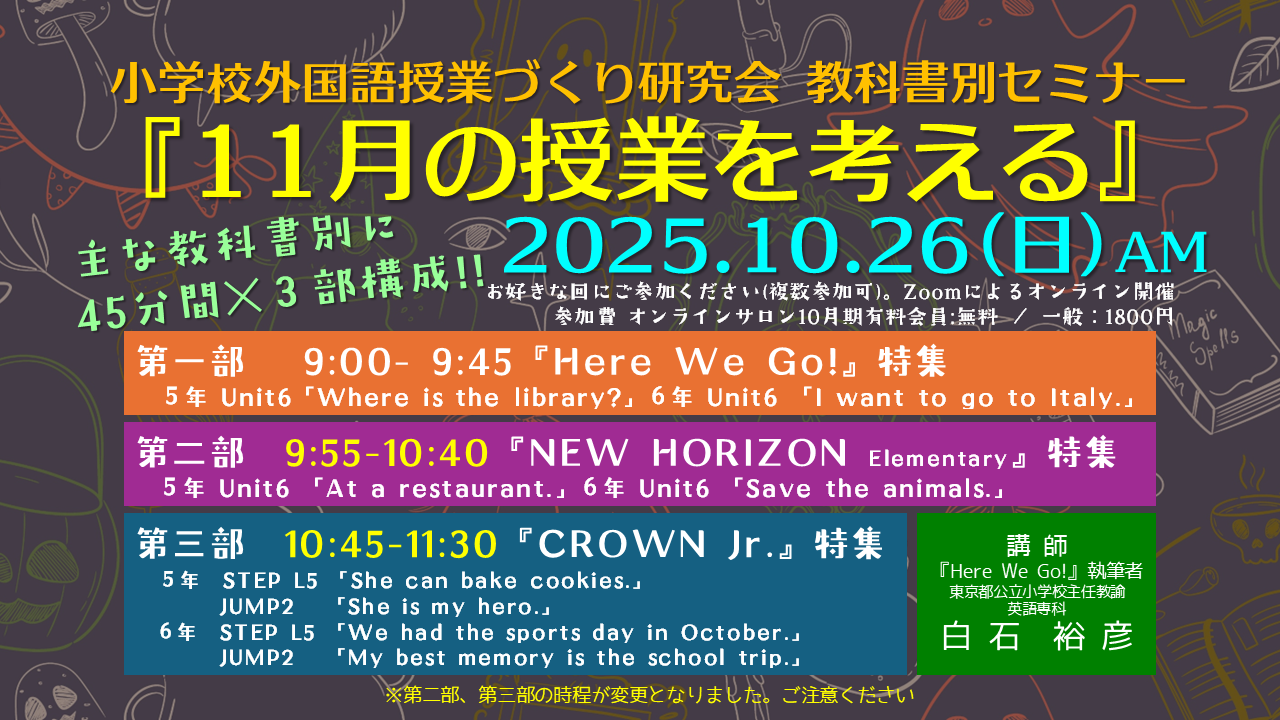 主な教科書別に11月の単元について解説します。45分間×3部構成です。お好きな回にご参加ください。複数参加することも可能です。複数参加しても参加費は変わりません。