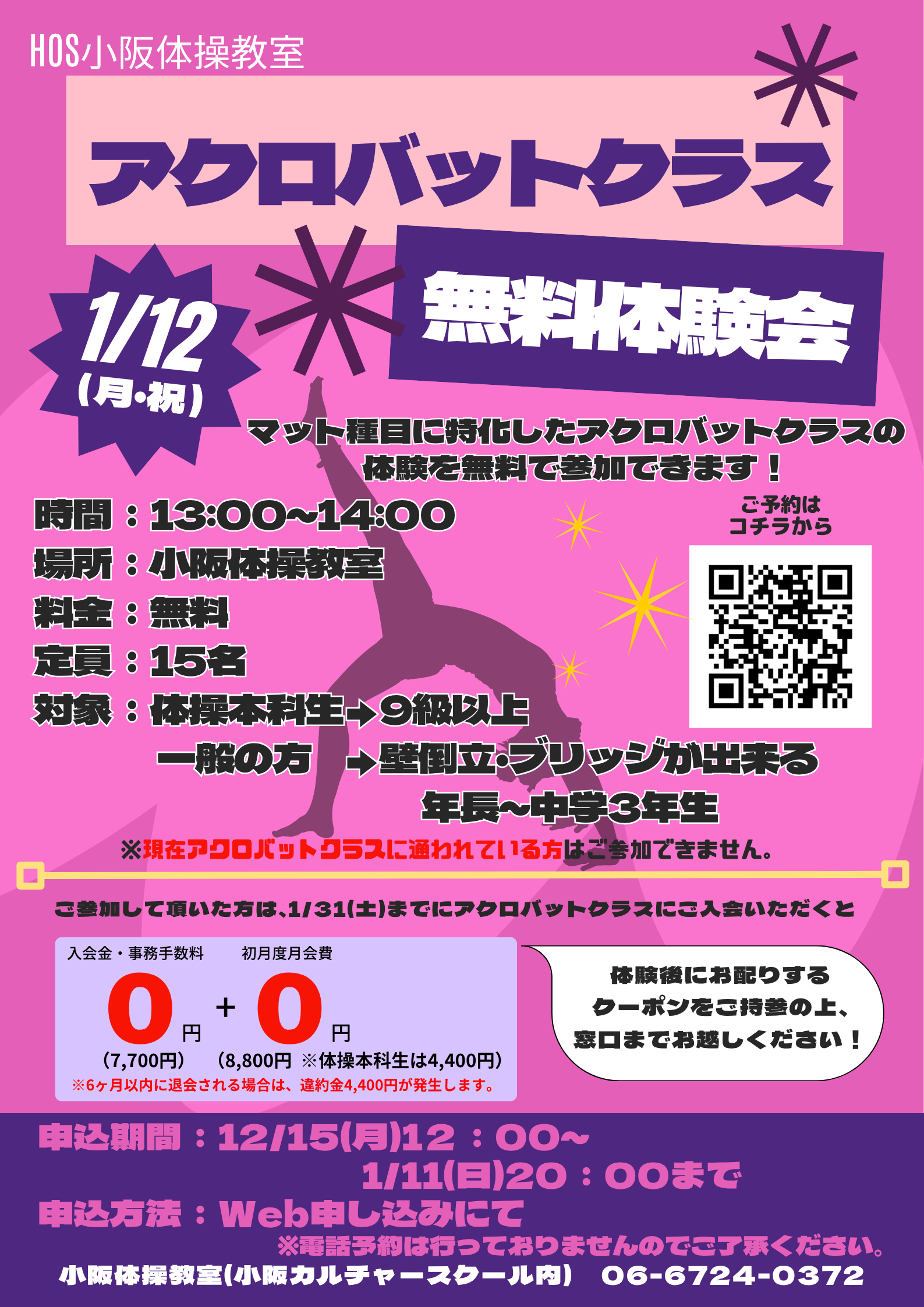 マットに特化したクラスのアクロバットクラスの体験を無料でご参加いただけます!