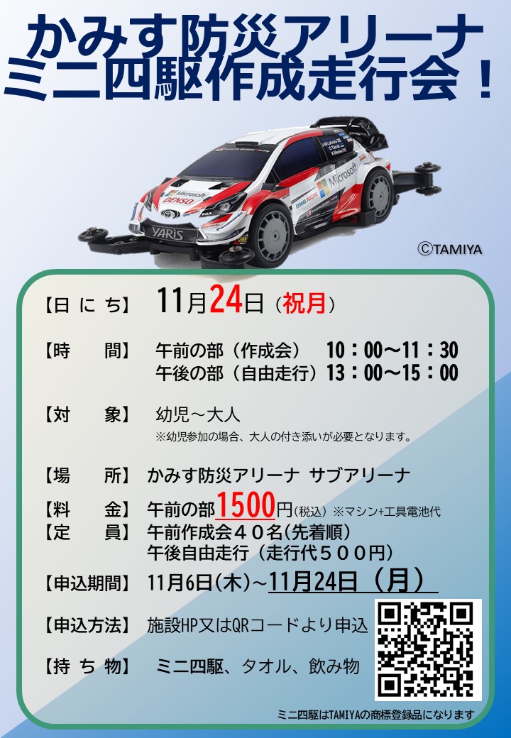 ※午後の部は今回申込以外のミニ四駆を持参し、コースを走らせることもできますが、当日、ご家族あたり1枚コース走行券(500円)の購入が必要となります。