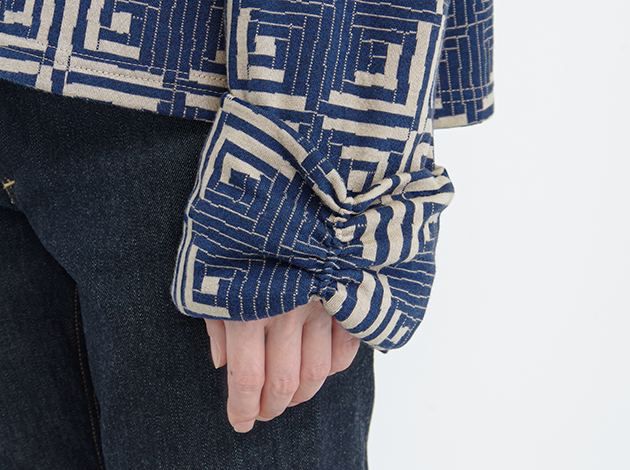 折り返しができるカフスは、カバーステッチミシン「Kanade」の縮み縫い機能でシャーリングを施しました。