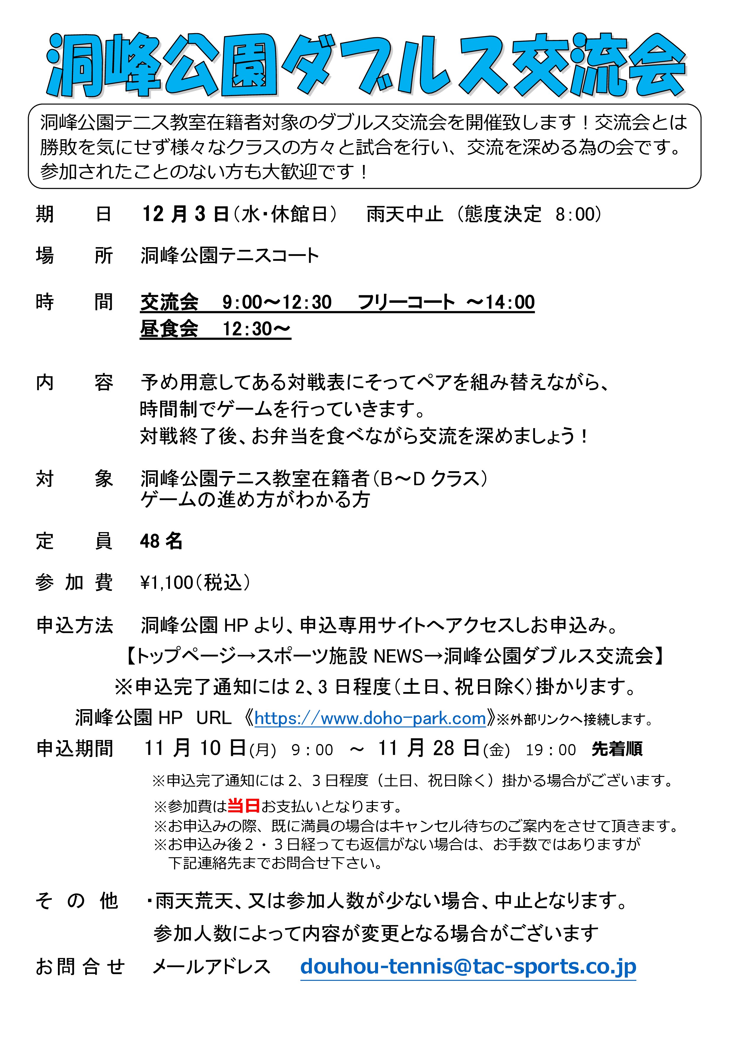 対 象 洞峰公園テニス教室在籍者(B~Dクラス)