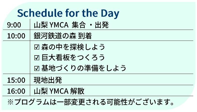 そして今回は、次回行う“秘密基地づくり”に向けた準備も行います。基地にぴったりの場所を探したり、森の使い方を考えたりと、仲間とアイデアを広げる時間にしましょう。