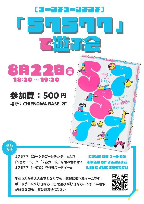 ボードゲームが好きな方、言葉遊びが好きな方、もちろん短歌が好きな方も、ぜひお集りください.。