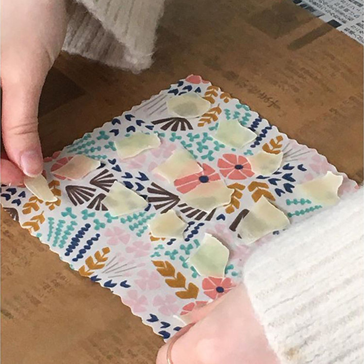 いま話題のみつろうエコラップ!オーガニックコットンにみつろう、ホホバオイル、天然樹脂を染み込ませた繰り返し使える食品保存用ラップです。初めての方でも、簡単に作れるエコラップです。