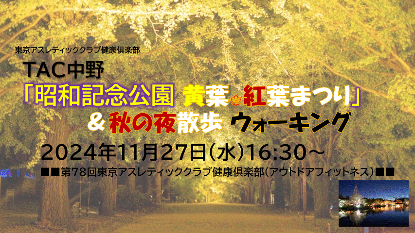 歩きやすい、動きやすい服装・履きなれたシューズ、 寒さ対策(手袋、マフラー、羽織るもの等)、タオル、飲料【昭和記念公園 黄葉 紅葉まつり&秋の夜散歩】について