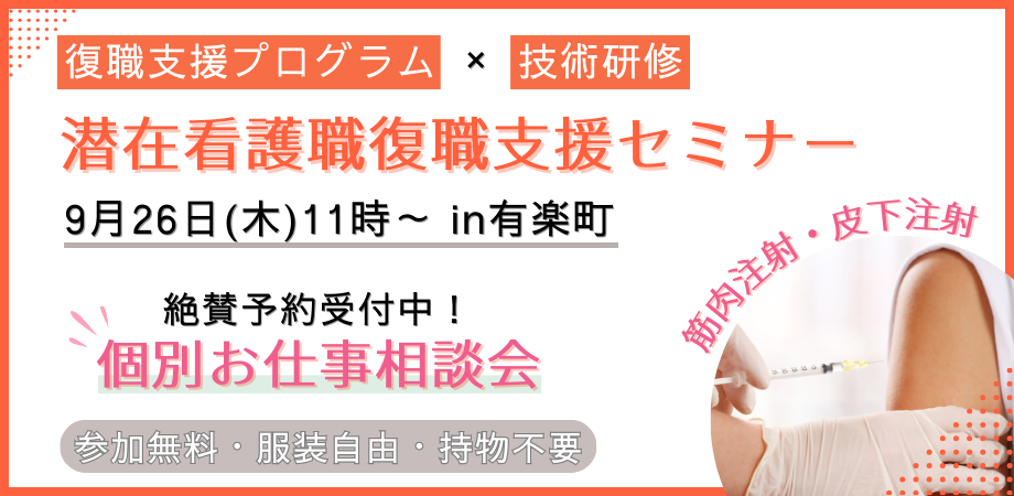 潜在看護職(ブランクのある方)向けの復職支援を目的とし、当社主催の筋肉注射&皮下注射の技術研修を9月26日(木)に開催いたします。