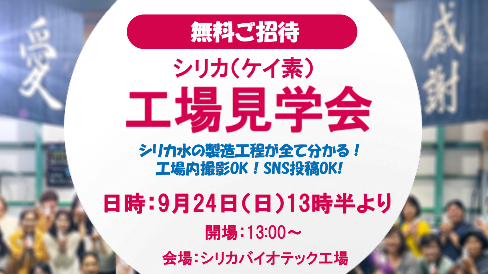 水溶性ケイ素ホワイトシリカの製造工場見学会です。参加費は無料。基本的に現地集合現地解散にて行います。13:00受付開始13:30スタートです。40名限定で定員になり次第締め切ります。遠足気分で終始楽しめますので、水溶性ケイ素愛用者の方はぜひお越しください!