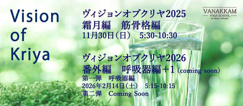 また、そのパッケージにお申込できるのも過去のヴィジョンオブクリヤを順に受講された方に限られております。今回特別に、皆様の健康を第一に考えるマスター・スダカーのご配慮により、ヴィジョンオブクリヤ2026番外編パッケージを受講していただけましたら、11/30 霜月編【筋骨格】、そしてこの後告知されます「ヴィジョンオブクリヤ2026パッケージ」にお申込み可能(オンタイムでのご参加が可能)となりました。
