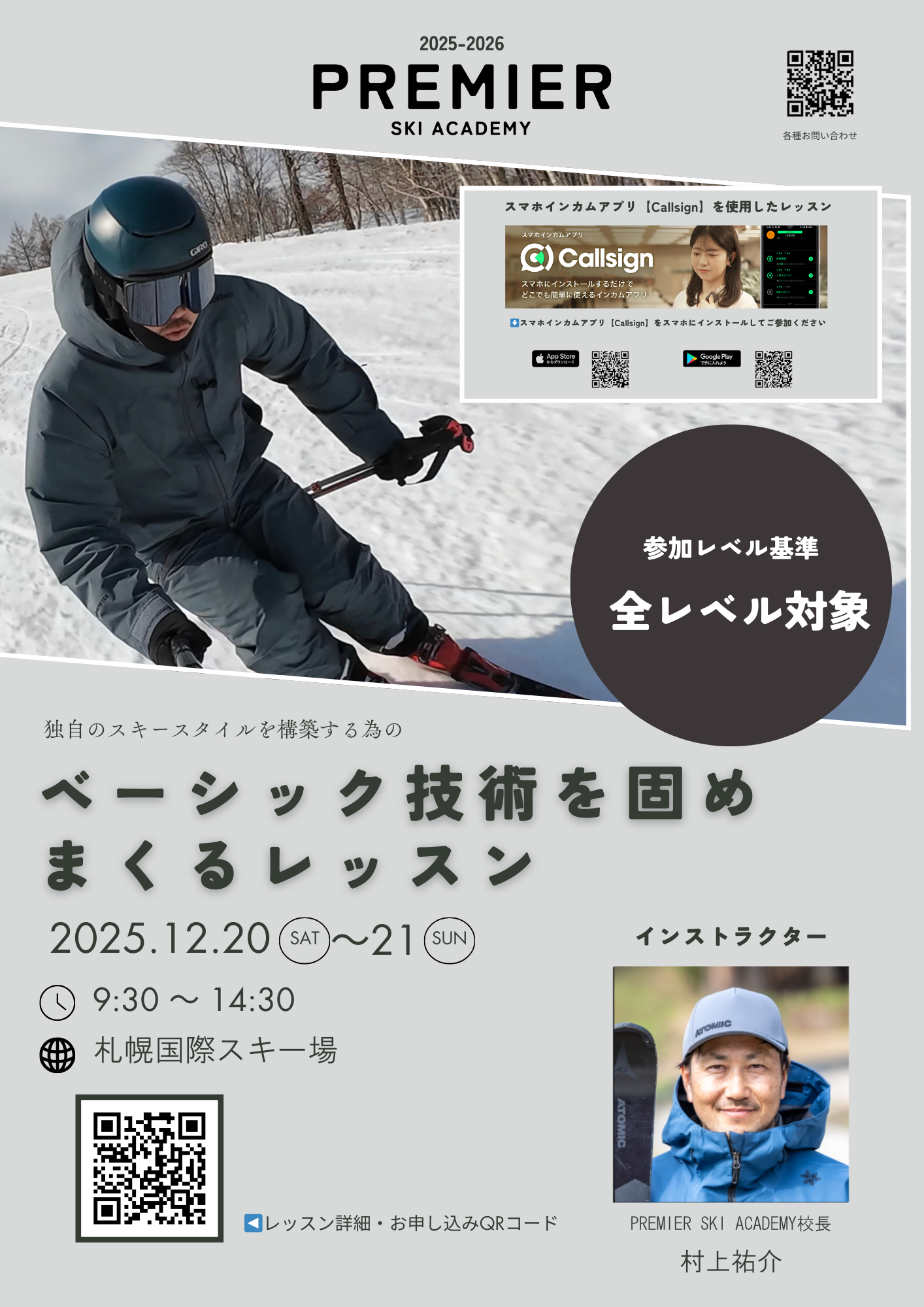 ■特色:PSA校長の村上祐介が担当する特別感のあるグループレッスンです。【ベーシック=基本テクニック】をシーズン最初に習得することで、受講者独自のスキースタイルの構築に寄与する技術アップに繋がる内容です。