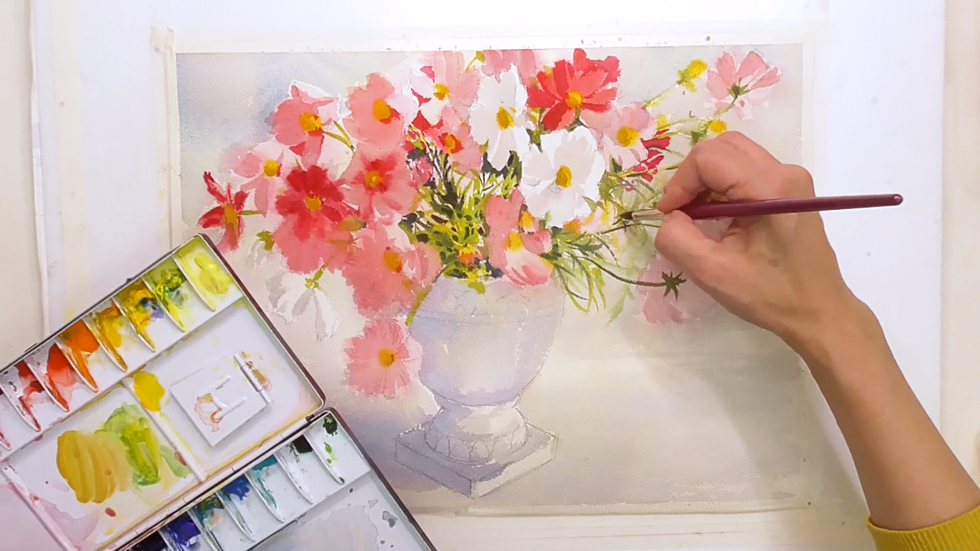 花を引き立てるため、緑の葉の存在をしっかり描きます。