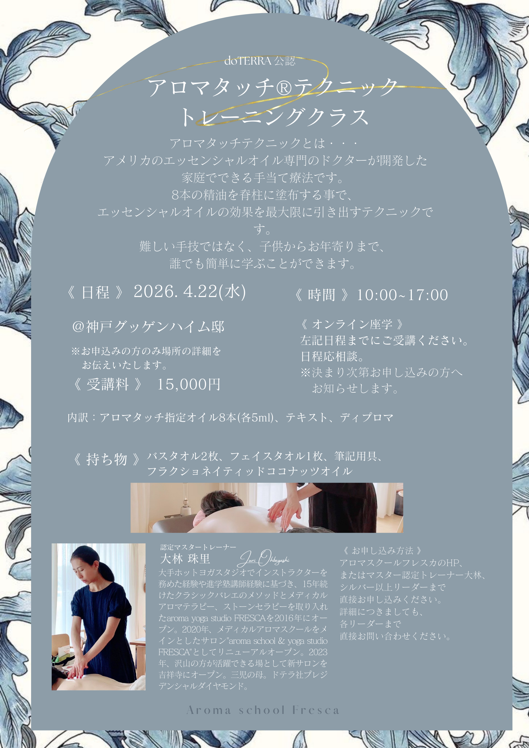 アロマタッチ基本指定精油8本、フラクショネイティッドココナッツオイル、バスタオル2枚、フェイスタオル1枚、筆記用具、ウェットティッシュ(使用したベッドや足裏を拭く用として)参加資格