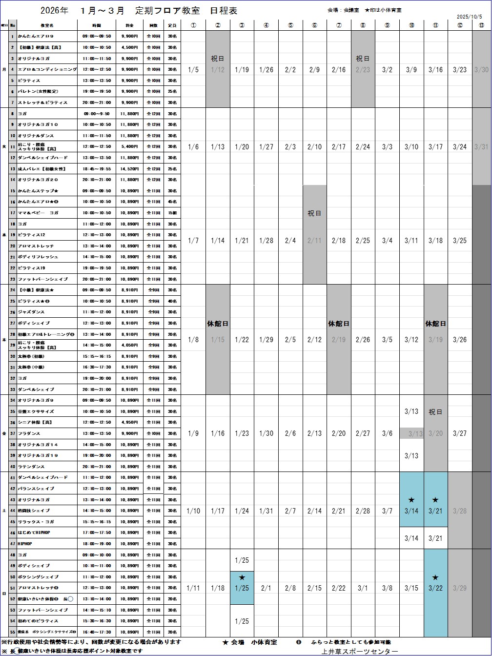 ・ 教室プログラムは定期的に見直してまいります。予めご了承ください。