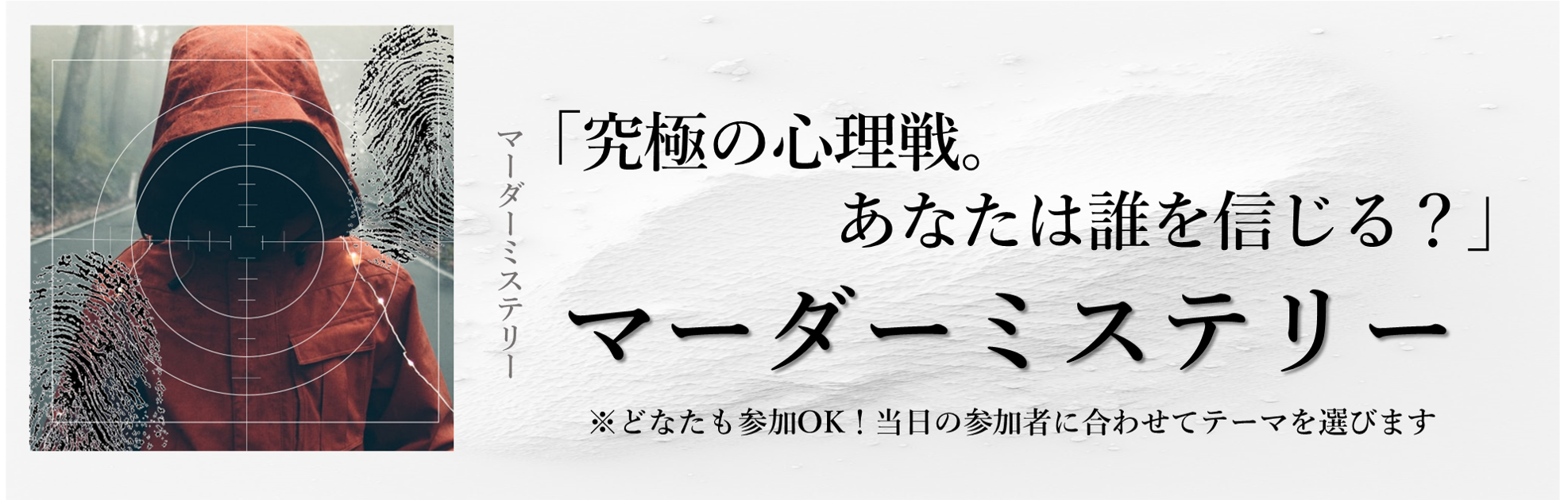 あなたは推理小説のファンですか?それとも、謎解きが好きですか?当イベントでは、マーダーミステリーゲームを通じて、推理小説の登場人物になりきる体験ができます。架空の殺人事件の謎を解き明かすことが、あなたに課せられたミッションです。
