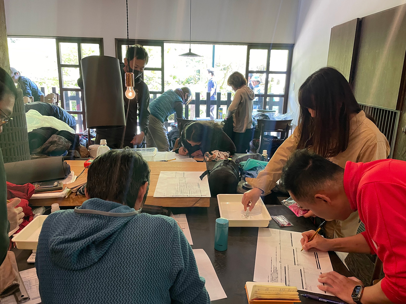 『山と道 京都』スタッフの久保田を講師に、各自が持参した道具のギアリストを作成しながら道具の取捨選択の方法を知り、UL装備化の手順やポイントを座学形式で学んでいきます。
