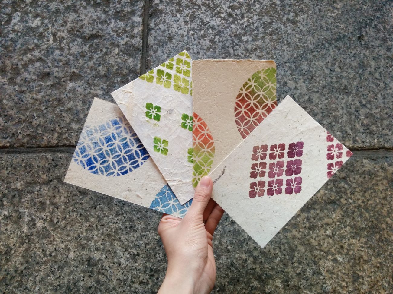 着物や帯の文様の染めに使われる「伊勢型紙」。日本の染め職人が実際に使っているお道具で、オリジナルの和紙はがきを作成。伊勢型紙1枚と、講座内で染めた和紙はがき2枚をお持ち帰りいただけます。日本の伝統に触れられる"aeru school"で豊かな感性を育みましょう。