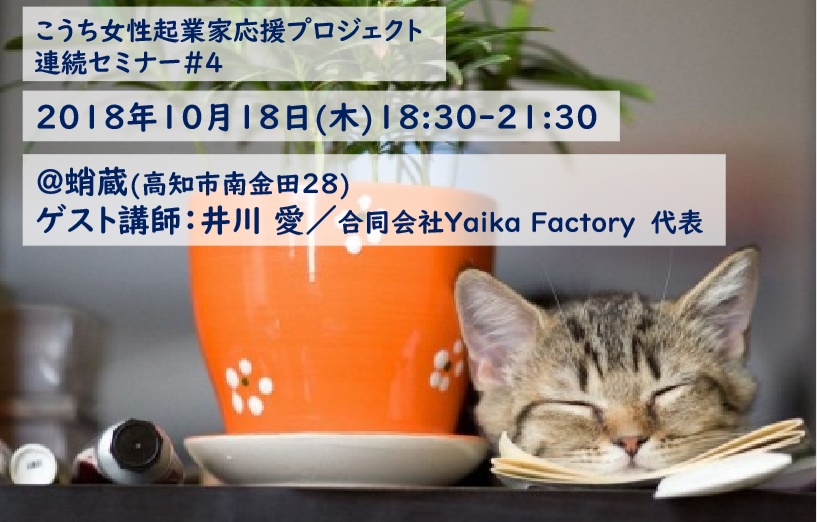 こうち女性起業家応援プロジェクト、第4回目となるセミナーでは、ゲストに、井川愛さん(合同会社Yaika Factory)をお呼びし、『好きを仕事にする秘訣ー移住女子の起業ストーリー』と題して、好きなことの掛け算、大きな夢と、小さな一歩、港町とネコとおばあちゃんプロジェクト立ち上げの経緯、これからのチャレンジ、についてお話しいただきます。