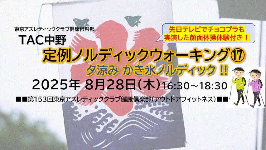 途中、正しいノルディックウォーキング方法を練習します。 先月TVにて、あのチョコプラも実演した「顔面体操」も体験して頂きます!