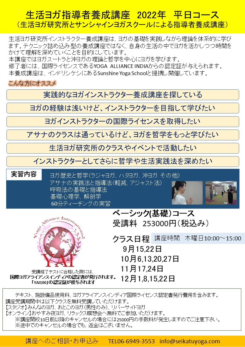 講座期間中は生活ヨガ研究所のクラス(みんなのヨガ、おとこのヨガ、リバーサイドヨガ、リラックス瞑想会、おやすみ夜ヨガオンライン)への参加が無料になります。特別WSやリトリート等は対象外です。