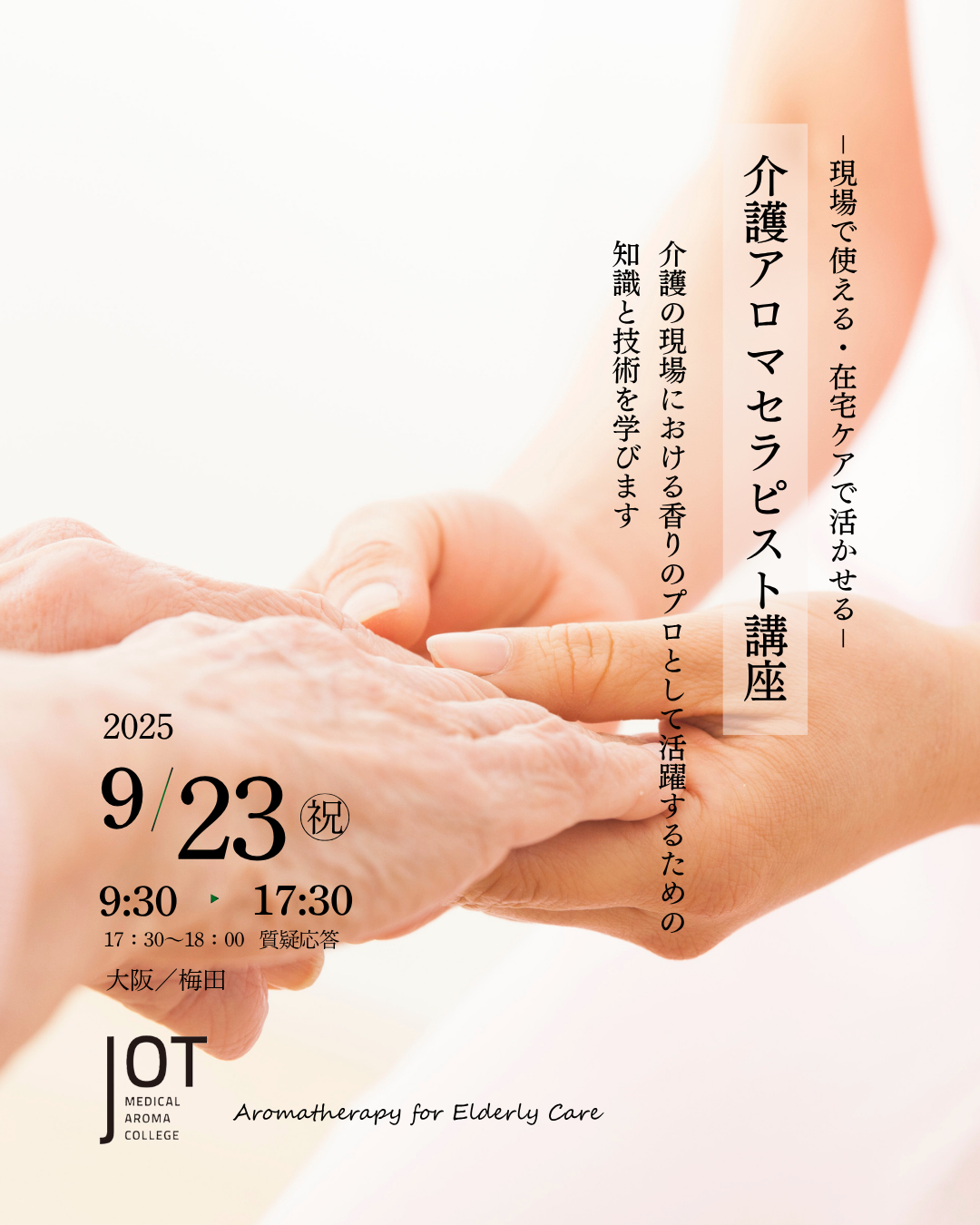 その香りの力を活用したアロマセラピーの有用性は幅広く、介護の現場での心や身体ケア手法として安全にアロマセラピーを取り入れる知識を学びます。