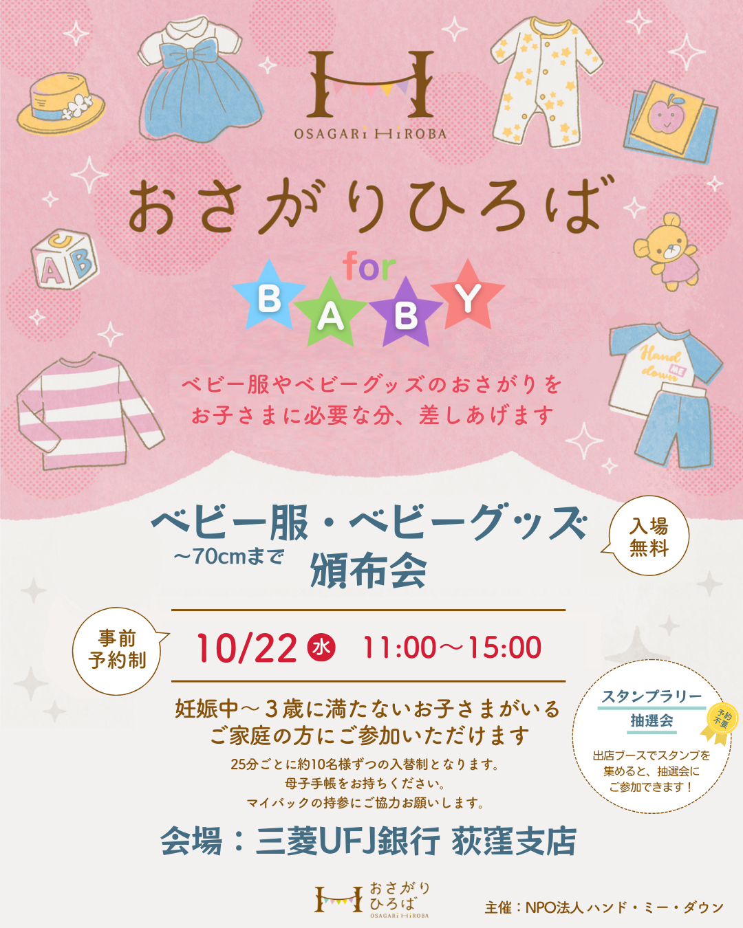 おさがりのベビー服(~70サイズ)、帽子やスタイ等ベビーグッズを、無料でお持ち帰りできる頒布会です。
